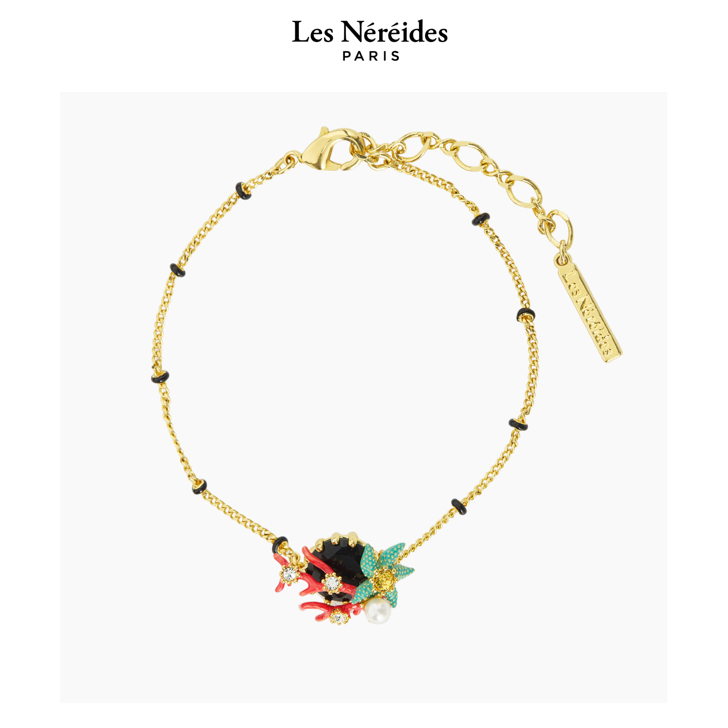 - Fine bracelet with round black faceted glass stones and marine elements: hand-enamelled red coral and blue starfish, cultured pearl. Gold-plated brass beaded chain.