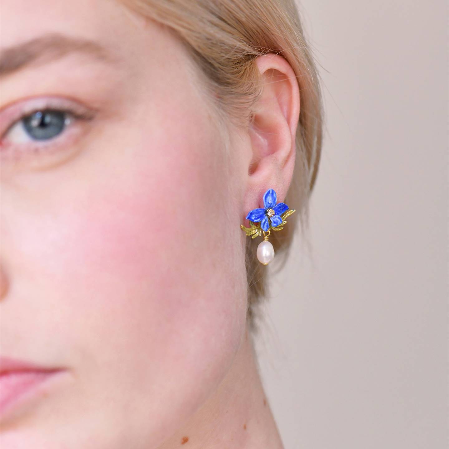 - Materials: Gold-plated brass (“brass gilded with fine gold”), hand enamel, faceted glass, and freshwater baroque pearls
