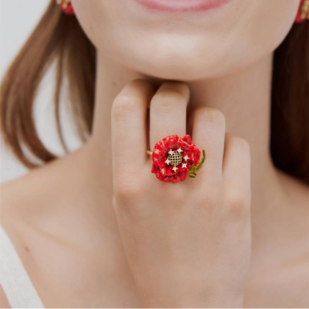 Les Néréides Ring Red Poppy and Cubic Zirconia BEAUTE DES CHAMPS
