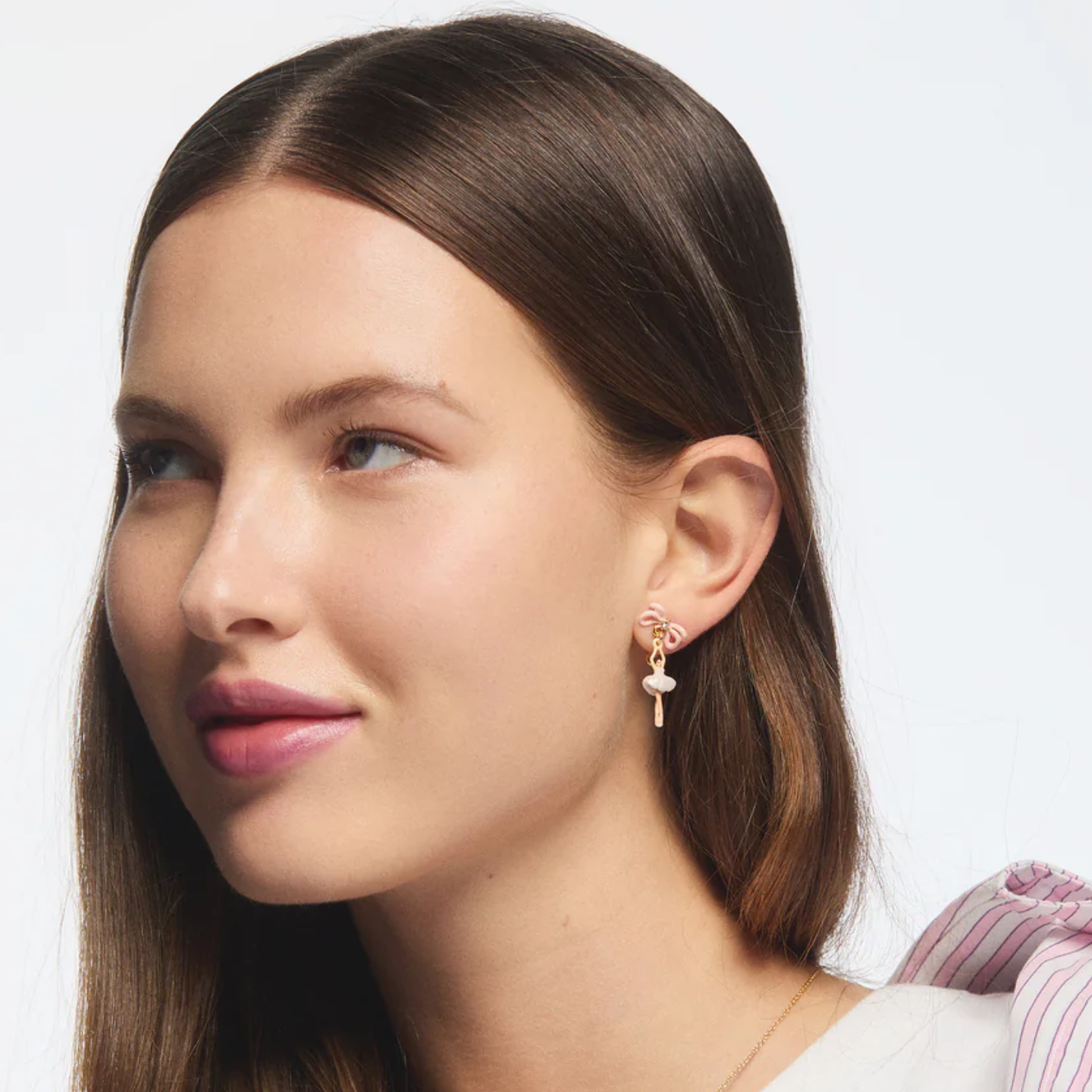 - Hand-enamelled ballerina dangle earrings, dressed in a white tutu, pink bow adorned with faceted crystal.
