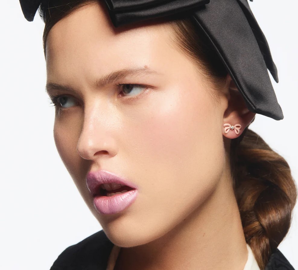- Hand-enamelled little pale pink ribbon post earrings adorned with faceted crystal.