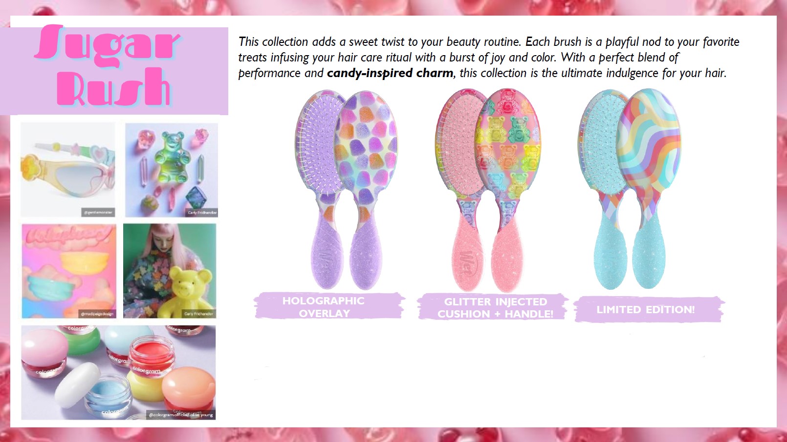 This collection adds a sweet twist to your beauty routine. Each brush is a playful nod to your favorite treats infusing your hair care ritual with a burst of joy and color. With a perfect blend of performance and candy-inspired charm, this collection is the ultimate indulgence for your hair.