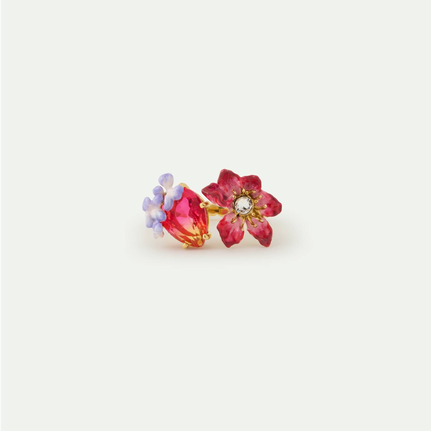 - Adjustable ring with pink clematis, faceted glass, and hand-enamelled purple wisteria, gold-plated brass.