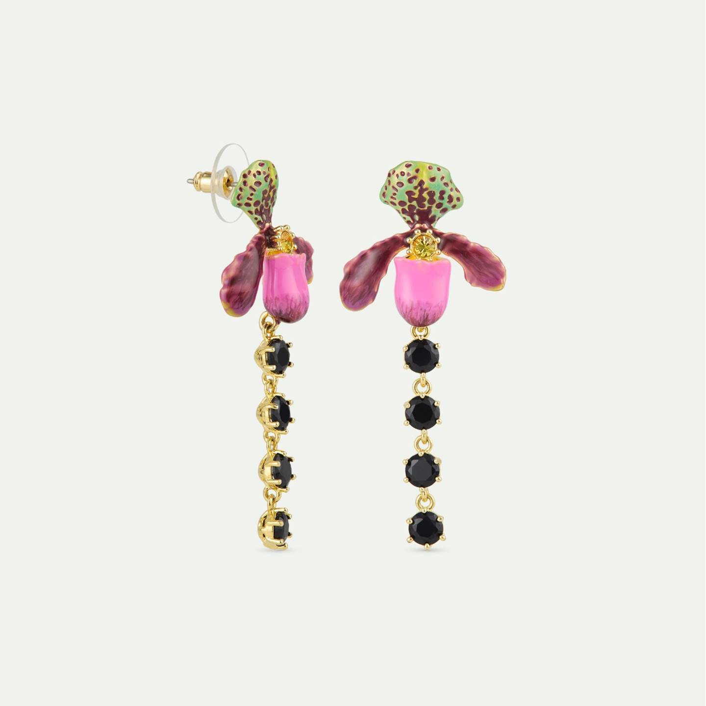 - Hand-enamelled purple lady's slipper orchid dangle earrings with black faceted glass and rhinestones.